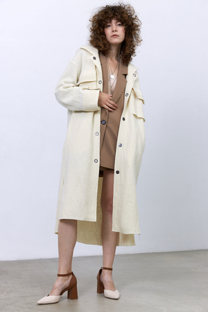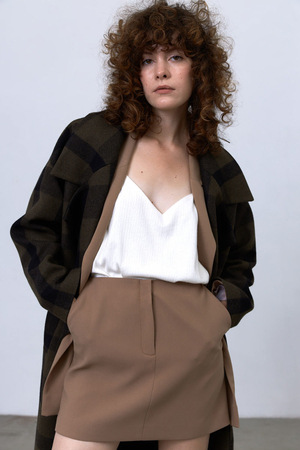 Мини-юбка с гульфиком из костюмного твила сделает образ более женственным и стильным.