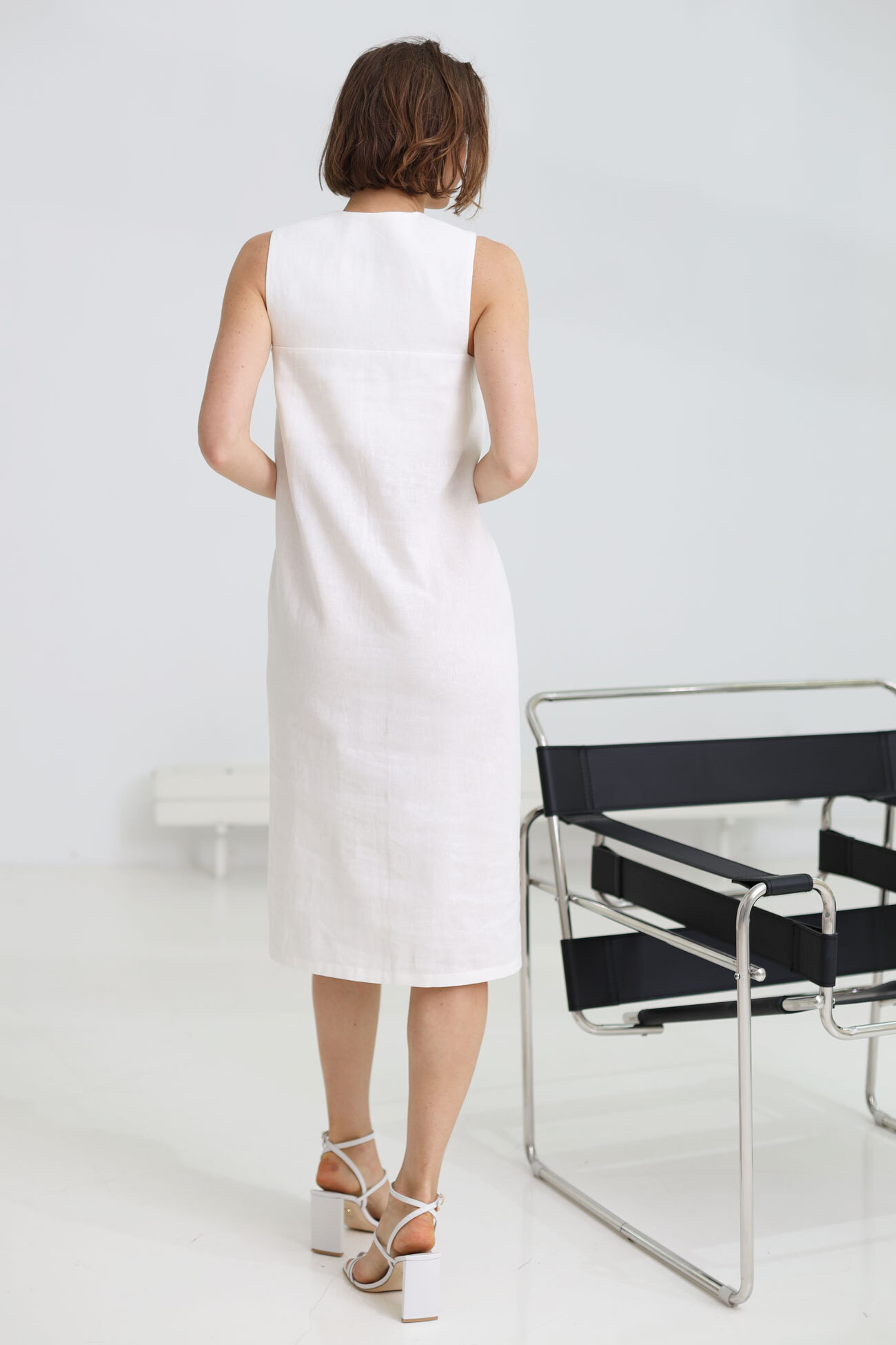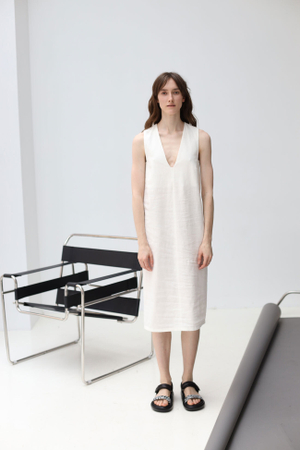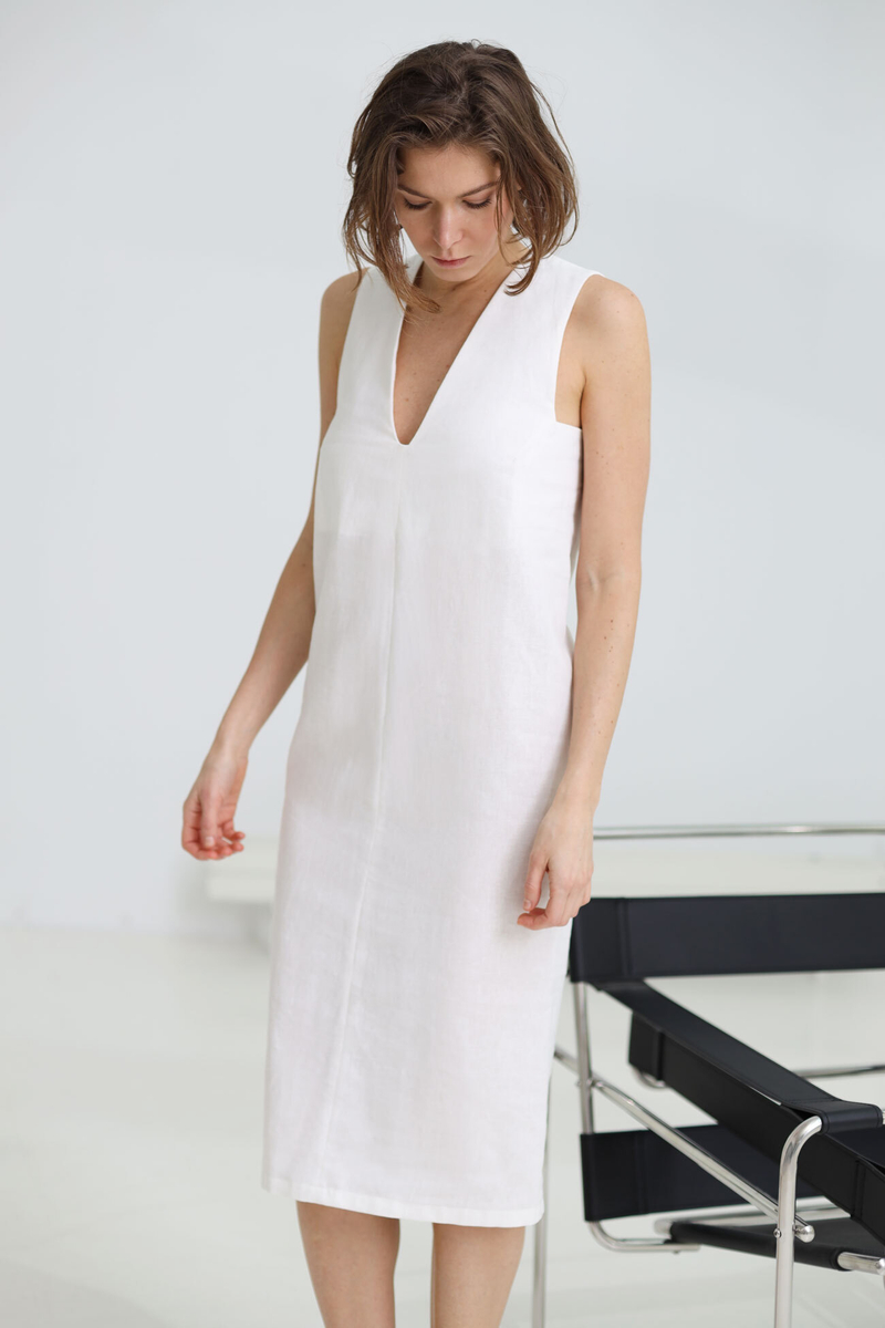 - Платье с вырезом на груди, лен молоко