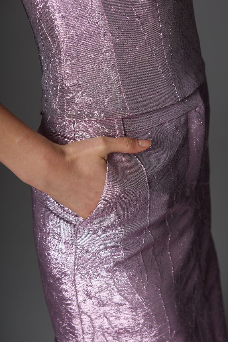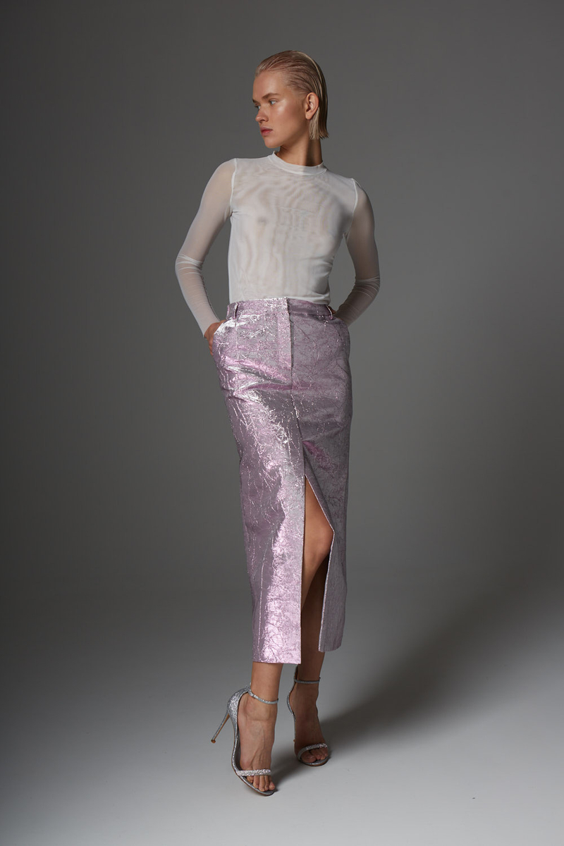 Элегантная юбка длины макси из жаккарда с металлическим блеском со шлицей спереди имеет базовый фасон и делает силуэт более женственным и стильным.